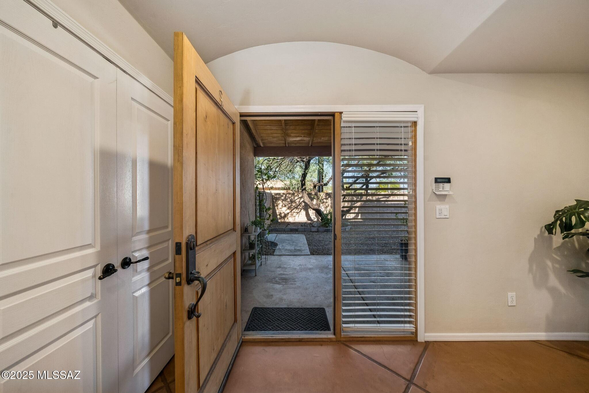 This 2003-built Southwestern-style residence perfectly blends modern comfort with authentic barrio charm--and includes the added value of paid-off solar, offering long-term energy savings with no compromise on style. A gated front courtyard with custom metal fencing and artistic accents warmly welcomes you, setting the tone for a home filled with character and thoughtful design. Inside, rich scored concrete floors and custom plantation shutters create a timeless aesthetic, while the corner beehive fireplace brings a cozy touch of the Southwest. The well-designed split floorplan offers privacy and flexibility, with generously sized bedrooms and abundant storage throughout. The spacious primary suite features a walk-in closet, and both bathrooms have been beautifully updated with elegant tilework and refined finishes. A separate laundry room adds functionality with a deep utility sink and ample cabinetry. Outdoors, the covered patio provides the ideal spot to unwind or entertain while enjoying Tucson's signature sunsets. This home is a rare findoffering distinctive style, energy efficiency, and everyday comfort in a vibrant and welcoming setting.