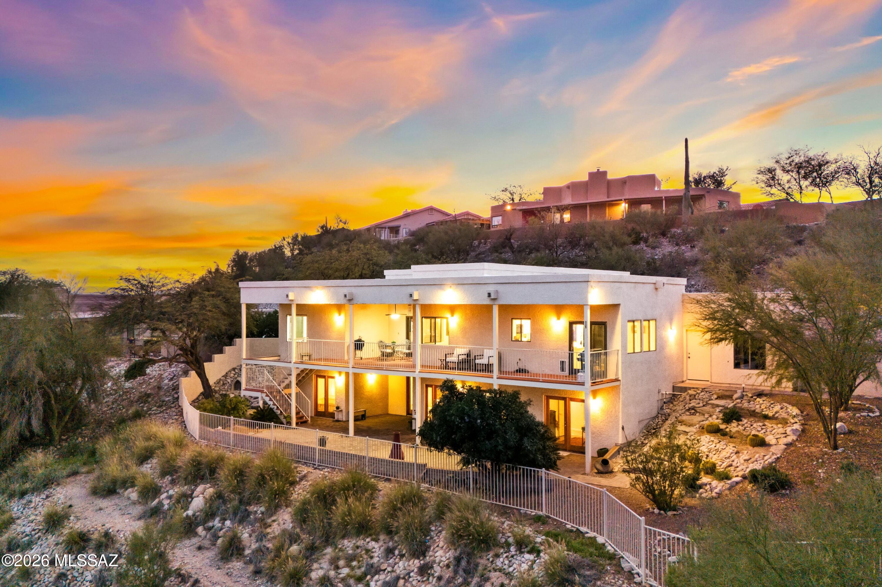 Enjoy sweeping, unobstructed views of the Rincon, Catalina, and Santa Rita Mountains, along with sparkling city lights, from this privately positioned hilltop residence in the gated community of Rio Robles Estates. Expansive, a full-length balcony and expansive patio create a seamless indoor-outdoor lifestyle, perfectly framing Tucson's breathtaking desert sunsets. Inside, the home reflects a refined yet contemporary aesthetic. Continuous warm wood flooring flows throughout the upper level, complemented by crisp white walls and thoughtfully designed architectural details. Art niches and display shelving add character and intention, while abundant windows invite in natural light and capture lush Sonoran Desert vistas from nearly every angle. The desirable split-bedroom floor plan offers...