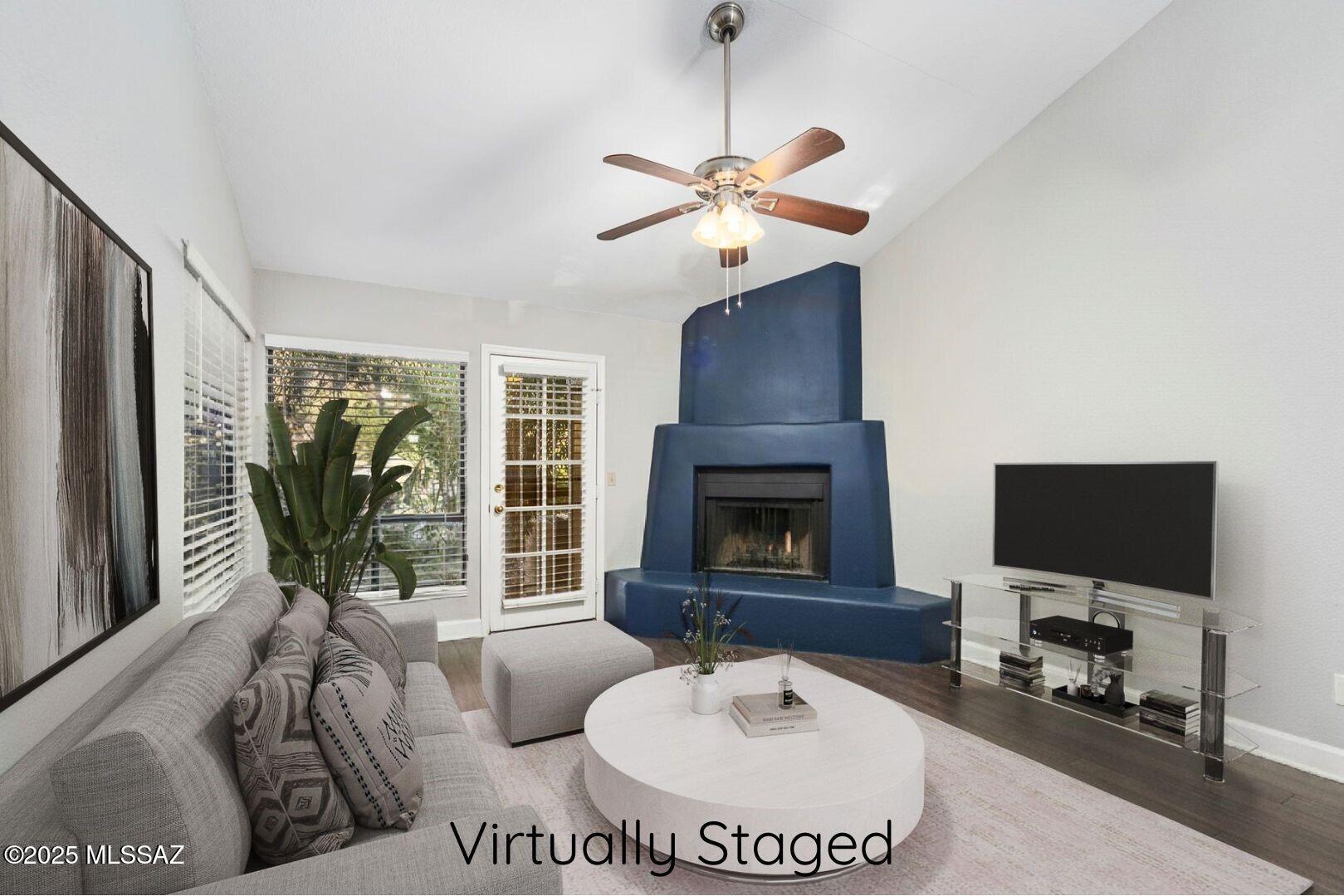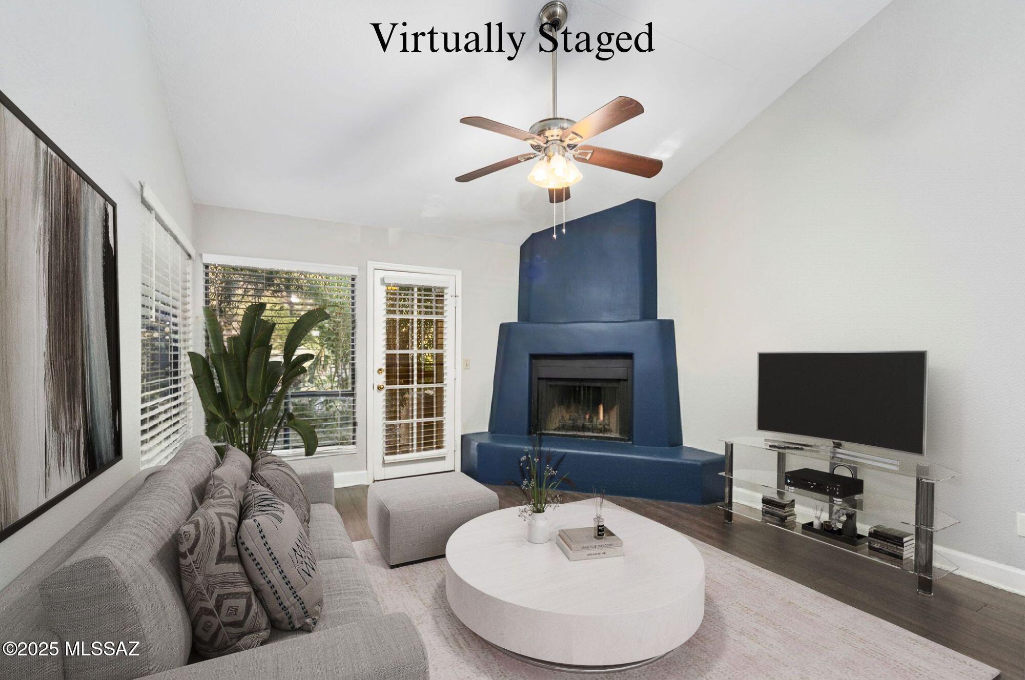Located within the prestigious gated Sin Vacas community in the Catalina Foothills, this beautifully updated townhome offers the ideal blend of luxury, comfort, and convenience. From the moment you arrive, you're greeted by Catalina Mountain views visible as you approach the front door, throughout the interior living spaces, and from the peaceful private patio. Inside, expansive high ceilings and abundant natural light create an airy, inviting atmosphere. The well-designed split floorplan flows seamlessly from room to room, with the living, dining, and kitchen areas anchored by a charming corner fireplace. Thoughtfully remodeled, the home features warm wood-plank flooring, fresh designer paint, and an elegantly updated bathroom showcasing solid-surface marble countertops ,modern Fixtures and refined lighting.The kitchen is bright and functional, complete with matching black appliances, a built-in microwave, tile counters, and a picturesque corner window. The spacious primary suite offers a generous walk-in closet and a private vanity area with marble countertops and a contemporary framed mirror.Residents of Sin Vacas enjoy exceptional community amenities, including a sparkling pool and spa, clubhouse, and scenic walking trails. HOA services provide true lock-and-leave convenience with water, garbage collection, fire protection, roof maintenance, exterior building care, and front-yard landscaping all included.Perfectly positioned near La Encantada, Whole Foods, top-rated restaurants, and some of Tucson's best hiking, this townhome delivers the very best of Foothills living, luxury, views, and a coveted low-maintenance lifestyle in one of Tucson's most desirable gated communities.