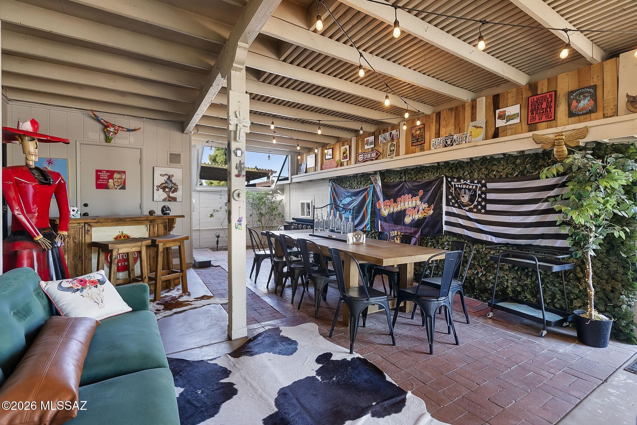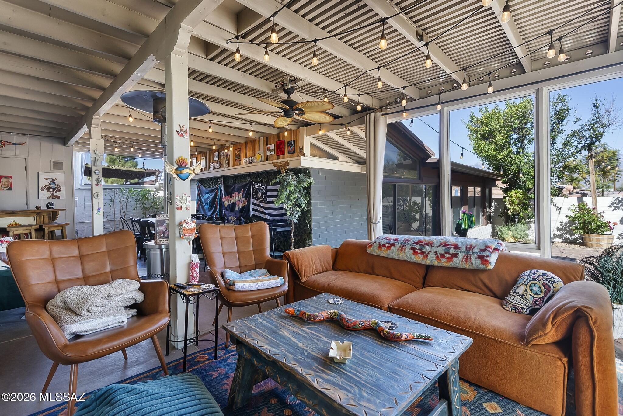 A truly unique opportunity, this elegant end-unit townhome in the desirable Desert Palm Townhouses community stands apart for its generous layout, thoughtful upgrades, and seamless indoor-outdoor living. The main residence offers three bedrooms and two baths, complemented by a rare attached studio with its own private entrance, providing exceptional flexibility for today's lifestyles. Design-forward details include skylights, a light-filled Arizona room with an exposed beam ceiling--an inviting space for everyday living and effortless entertaining. The kitchen is both functional and stylish, featuring Shaker-style cabinetry, tile backsplash, and a seated breakfast bar ideal for casual gatherings. The owner's suite enjoys direct access to the Arizona room and is complete with dual closets and a private en-suite bath.The separate studio is perfectly suited for multi-generational living, guest quarters, a home office, or potential rental income. A brand-new HVAC system adds comfort and peace of mind. Residents enjoy access to a sparkling community pool and a prime location close to Tucson's best dining, shopping, entertainment, and recreation.